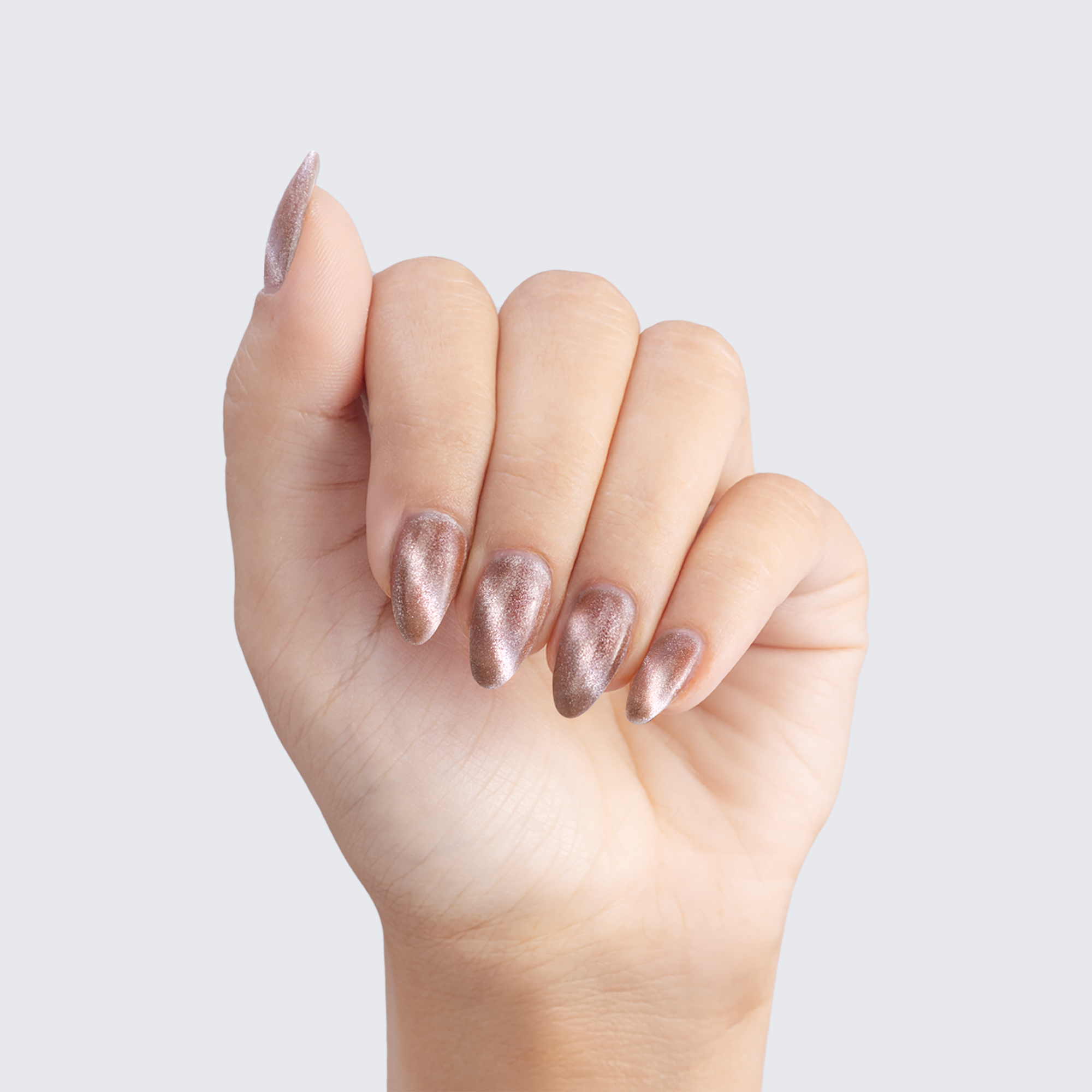 Tan. Medium. Rose gold magnetic shimmer. Opaque. Warm undertone.
